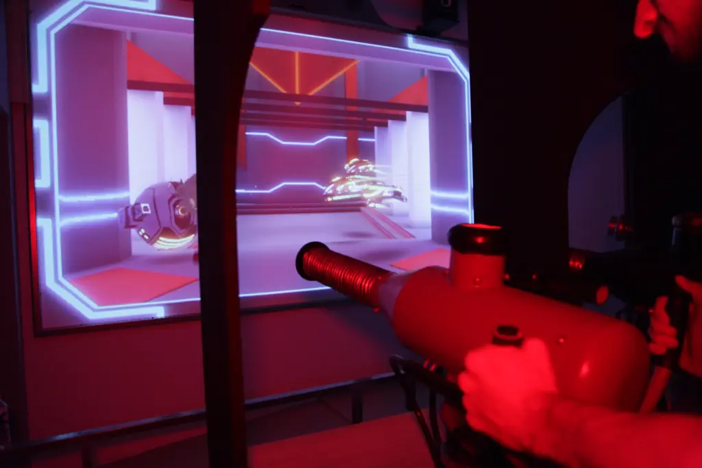 Personne jouant à un jeu de tir en réalité virtuelle.